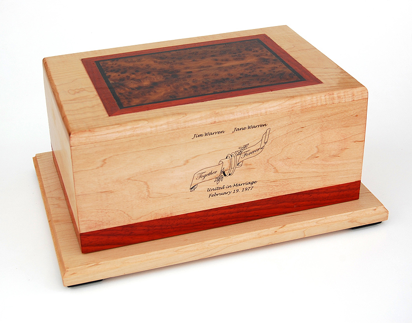 The exact size of the internal (and thus external) dimensions of this urn is dependent upon the size of the two people whose remains will reside in each chamber; the urn in this picture specifically was for a man of 200 pounds or less and a woman 160 pounds or less. The internal dimensions are calculated by simply converting the person’s weight to cubic inches – a 200 pound man would require 200 cubic inches of space. I will over build the dimensions by about 10 percent for safety. Typically, urns are accessed through the bottom – and that is the case here, with 4 wood screws of moderate size.