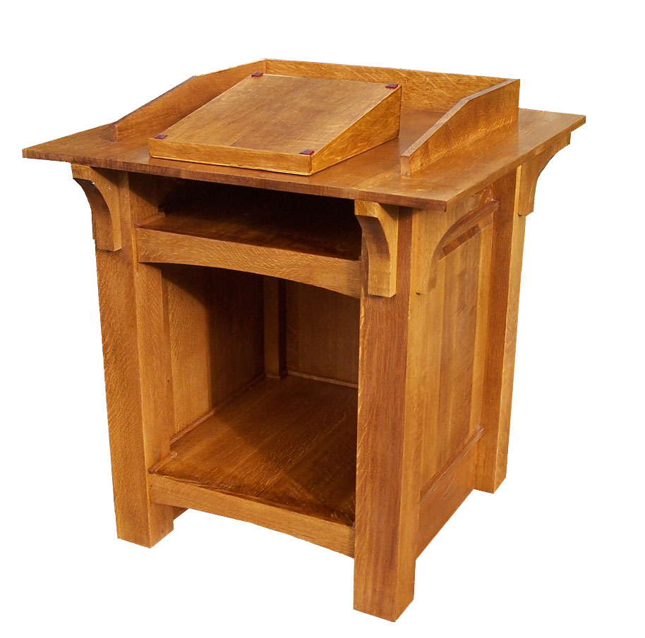 The New Mission Workshop pulpit features raised panels, corbel supports under the main table, a privacy gate, and a removable book riser – for those times when you need to use an overhead projector, computer, or other apparatus. The legs, massive at 4 inches across, are also quarter-sawn on all four sides – unheard of today.