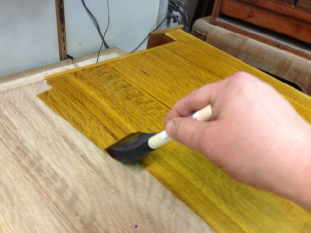 Finishing. No, I don’t mean finishing the project, as in completing it, but rather applying stains or topcoats. It’s an interesting part of the project, because it can really make or break a project. Poorly, done, it can make an otherwise great project look amateurish, and just really ruin the beauty of the wood. Done well, it just sets the piece off wonderfully. Common problems are blotchiness (think cherry), drips and sags, orange peel, dust – and glue squeeze outs, where the now-dried glue prevents any stain or dye from penetrating, and sticking out like a sore thumb. Sure, you can try to sand it down, but then you’ll you’ll probably leave a depression, because you have to sand quite deep, as the glue seeps into the pores quite a bit. Ugh.