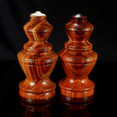 When you find something that sells, concentrate on making that one thing – and make it extremely well. Master that one form, then improve it – and improve it again. Move on to the next only when you have explored that form as far as you are able. I began by making my “Olde Tyme” series pepper mills. Period. For over a year, I only made that one style of pepper mill and sold them at a very reasonable rate making little or no profit. Patrons then asked for matching salt shakers. So I learned to make two forms – the salt shaker and pepper mill – that were virtually identical (at least to the naked eye) and it grew from there. Q. What skill would you like to learn, or some part of woodworking that you haven’t pursued that you would like to?