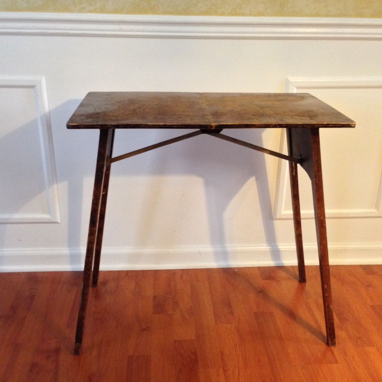 My friend, Travis Piper, showed me this table he has had since he was a kid; it’s thought to be from the 1930s. It’s very unique the way it folds up when picked up in the middle. I really like the design, shaker-esque in nature. I modeled it in Sketchup. My only change was to the skirt, adding and arch, instead of the mild scallopy profile that is on the original. My rendering’s metal support rails are a bit too slivery; I think I would make them a flat black, if I were to make a reproduction.